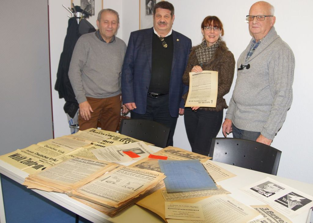 Foto: Erste Sichtung der Originale (von links): Peter Nickel, Amtsleiter Walter Dreßbach, Christine Raedler und Otto Böhlke.