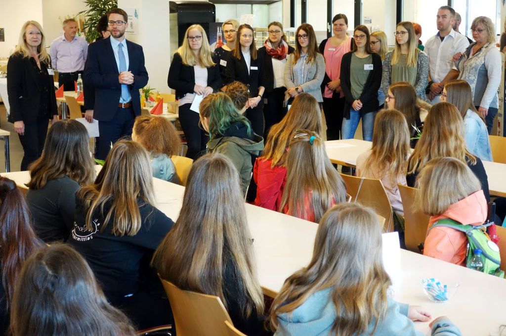Foto: Aufgrund einer parallelen Veranstaltung begrüßte Landrat Thorsten Stolz die Teilnehmerinnen gemeinsam mit den Organisatorinnen in der Kantine der Kreisverwaltung.