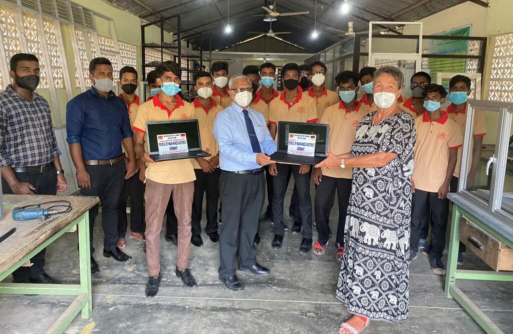 Foto: Ursule Conen bei der Übergabe von Laptops an die Ausbildungsklassen des Technical Instituts in Beruwala.