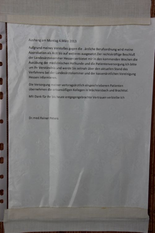 Eine Gemeinschaftspraxis in Wächtersbach hatte letztlich doch noch ein Einsehen und nahm Kaim auf. Dort hatte auch seine Such begonnen, nachdem er bei seinem bisherigen Hausarzt Dr. Rainer Peters vor verschlossenen Türen stand. Diesem wurden wegen eines Verstoßes gegen die ärztliche Berufsordnung die Approbation entzogen, so dass Kaim und auch viele andere Patienten aus Wächtersbach plötzlich ohne Hausarzt dastanden. Ähnlich ging es den Bürgerinnen und Bürgern in Birstein, nach dem dort eine Praxis aus Altersgründen geschlossen und kein Nachfolger gefunden wurde.