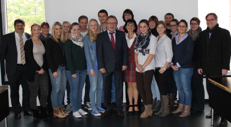 Foto: Landrat Erich Pipa (Bildmitte) heißt Studenten der Verwaltungshochschule im Main-Kinzig-Forum willkommen.