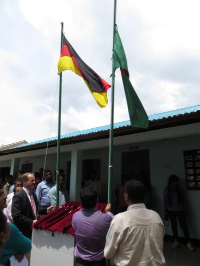 Nagelneu und frischgestrichen funkeln die beiden Gebäude in der gleißenden Mittagssonne: links das Schulungszentrum mit Bürotrakt, rechts die Schule für etwa 300 Kinder. Dazwischen ist heute ein großes Zelt errichtet, in dem die Besucher schon geduldig warten, bis die Gäste aus Dhaka eintreffen; einige Stunden Fahrt sind es von der Hauptstadt bis in den Nordosten des Landes. Nach einer kurzen Erfrischung kann endlich die Einweihungszeremonie beginnen. Jeder Vertreter darf ein paar Worte weitergeben; der örtliche Mullah, hinduistische Priester und ein christlicher Pastor sprechen ein Gebet. In seiner Ansprache betont Dr. von Weyhe, dass Bangladesch derzeit ein Schwerpunktthema für die deutsche Regierung ist.