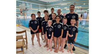 Die erfolgreiche Mannschaft der Gelnhäuser Wasserspringer (von links): Hinten Jakob Groß, Oskar Berg, Kyrylo Chepets, Mitte Emma Kraft, Jonah Sauer, Emily Krieger, Dieter Dörr, Marco Mazzone, vorne Frieda Alt, Rim Ascour, Hugo Euler, Raffael Mazzone.