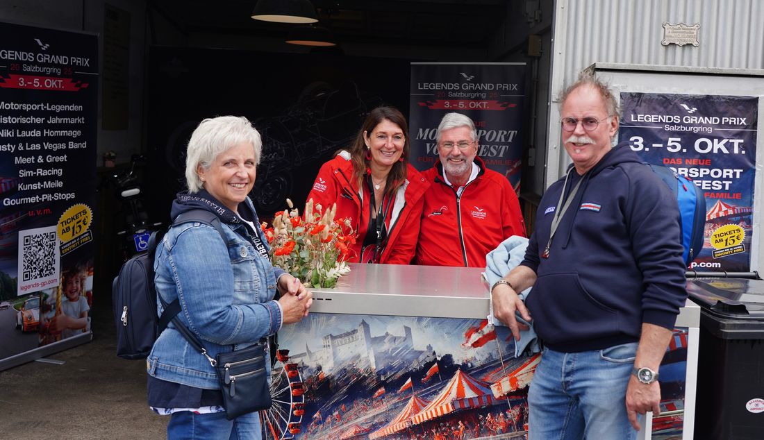 Während des Oldtimer Grand Prix getroffen: Der General Manager und Veranstalter des Edelweiß Bergpreises in Berchtesgaden und der neuen Veranstaltung, die „Legends Grand Prix“ vom 3.bis 5. Oktober 2025, auf dem Salzburgring, Joachim Althammer und Ehefrau Petra zusammen mit Birgit und Michael Warmuth aus Kahl am Main, die 2024 beim Bergrennen in Berchtesgaden mit einem Ford Capri teilgenommen haben und über die wir in Vorsprung Online berichtet hatten.