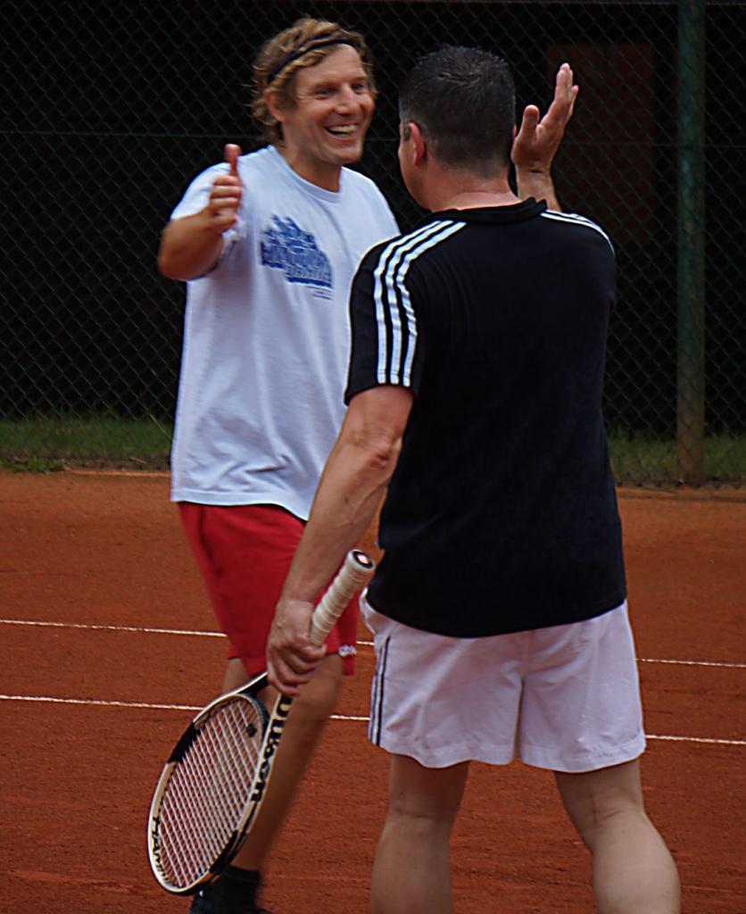 Foto: Mannschaftsführer Claus Bittner (vorne) und Debütant Ingo Birkenberger (hinten) klatschen sich nach dem entscheidenden Sieg im Doppel gegen den TC Langenselbold ab (Fotoquelle: Peter Köstner).
