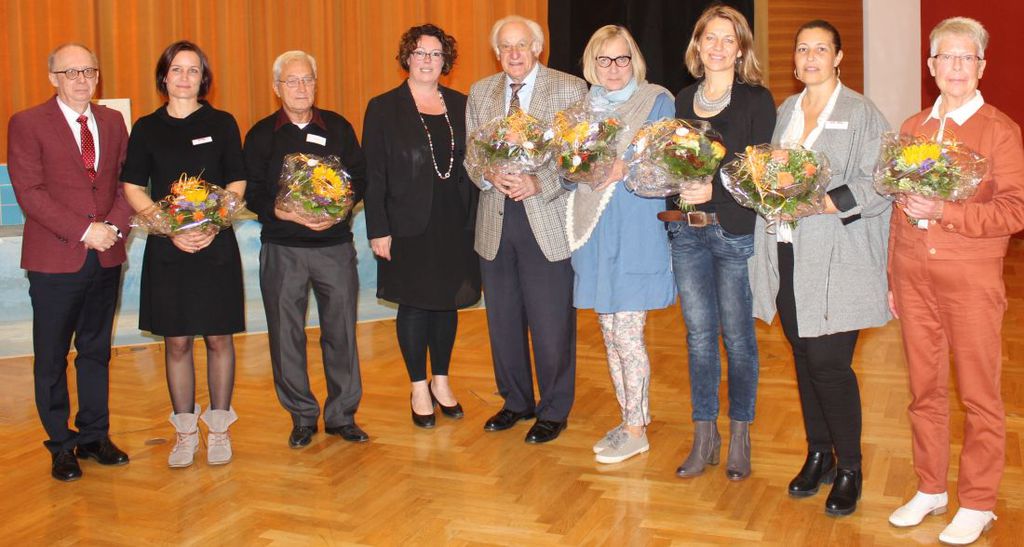 Foto: Blumensträuße und Dank für die Verantwortlichen, die nicht nur diesen Tag gestalteten, sondern sich für die an Demenz Erkrankten einsetzen. (v.l.: Sozialamtsleiter Klaus Pichl, Nadja Semm, vom Projekt SOwieDAheim, Wolfgang Kittel, vom Vorstand der Alzheimer Gesellschaft Main-Kinzig, Erste Kreisbeigeordnete Susanne Simmler, Vorsitzender der Alzheimer Gesellschaft Main-Kinzig Hans Burckhardt sowie Gabriele Karadeniz, Yvonne Zednik, Viyal Lode vom SOwieDAheim-Projekt und Barbara Gregor, Initiatorin des Projektes).