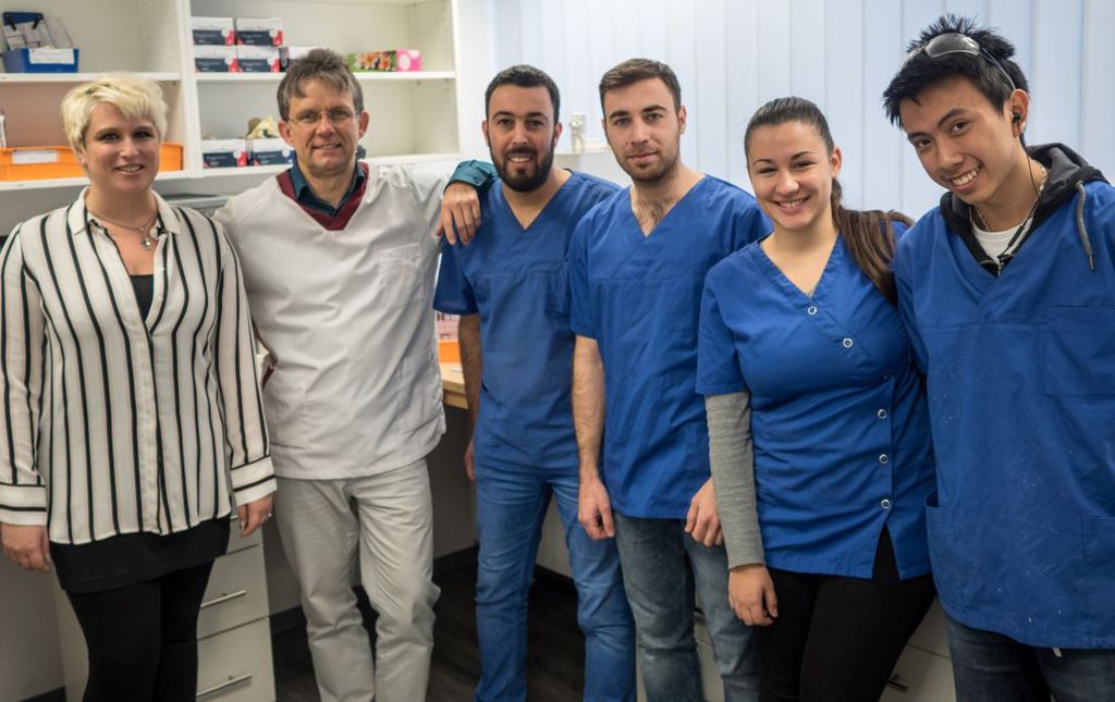 Mit ihrer Unterstützung findet der Wahl-Hanauer zunächst einen Praktikumsplatz in der Zahnarztpraxis von Dr. Ismail Derin und Dr. Rachid Boulaaouin. Die Praxis liegt mitten im Herzen Frankfurts – direkt an der Zeil. Mit alleine 14 Zahnärztinnen und Zahnärzten zählt sie nicht nur zu den größten der Main-Metropole, sie ist auch sehr multikulturell. Mitarbeiter und Patienten stammen aus aller Herren Länder; in den Behandlungsräumen und Wartezimmern kann man neben Arabisch und Türkisch auch Farsi oder Urdu hören. In diesem weltoffenen Umfeld fällt es Fahd Alloush leicht, sich einzuleben und schon nach wenigen Wochen hält er einen festen Arbeitsvertrag in seinen Händen. Trotz des internationalen Klimas legt er aber großen Wert darauf, ausschließlich deutsch mit seinen Kollegen zu sprechen. „Fahd bringt sehr solide Vorkenntnisse mit“, lobt Andreas Nieporte, Leiter des Praxis-eigenen Labors und Zahntechnikermeister. Die Anforderungen in einem deutschen Labor seien zwar besonders hoch, Fahd Alloush sei es aber gelungen, sich rasch diesem Niveau anzupassen. „Es kommt bei uns auf absolute Feinheiten an, etwa dass wir bei jedem Patienten den Farbton des Zahnes exakt treffen“, erläutert Herr Nieporte.