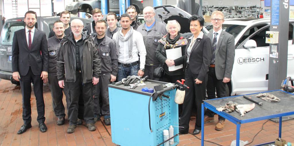 Über verschiedene Zwischenstationen knüpfte Oergel schließlich einen Kontakt zum Autohaus Geiger & Liebsch in Linsengericht Altenhaßlau. Alkaraf, der derzeit von Arbeitslosengeld II lebt, gelang es Ulrich Liebsch und dessen Service-Leiter Steffen Hertel mit seiner Aufgeschlossenheit und Beharrlichkeit zu überzeugen. Parallel schaltete sich Erika Kollmann vom Jobcenter des Kommunalen Centers für Arbeit (KCA) ein. In enger Abstimmung mit dem Arbeitgeber organisierte sie zunächst eine mehrwöchige Trainingsmaßnahme im Betrieb. In dieser Zeit erarbeitet sich der Syrer den Respekt seiner Kollegen. „In der Werkstatt gibt es eine sehr direkte Feedback-Kultur“ schmunzelt Steffen Hertel. „Hier erhält allem voran Anerkennung, wer anpackt, mitdenkt und lernbereit ist.“ Mit Beginn des neuen Ausbildungsjahres darf Wail Alkaraf dann auch die langersehnte Ausbildung zum KFZ-Mechatroniker anfangen. Bis dahin arbeitet er zur Überbrückung nachmittags auf Mini-Job-Basis bei Geiger & Liebsch und absolviert vormittags einen Intensiv-Sprach-Kurs. Auf dem weiteren Weg zum Traumberuf ebnet ihm KCA-Frau Kollmann noch eine weitere wichtige Hürde: Das Jobcenter finanziert ihm den PKW-Führerschein mittels eines Bildungsgutscheins. Dieser vereinfacht die Arbeit mit den Kundenfahrzeugen wesentlich. Gleichzeitig unterstützen ihn auch seine Kollegen nach Kräften, sei es bei Behördengängen oder auch dabei eine eigene kleine Wohnung zu suchen, damit er aus der Gemeinschaftsunterkunft ausziehen kann. „Das ist Grundvoraussetzung für eine erfolgreiche soziale und sprachliche Integration“, meint Hertel. Bei Geiger & Liebsch ist diese Integration schon vorangeschritten: So ließ sich Wail Aklaraf etwa bei der Weihnachtsfeier nicht zweimal bitten, beim traditionellen Armdrücken anzutreten. Trotz seines kräftigen Bizepses langte es diesmal noch nicht für einen Podiumsplatz, es fehlte ihm noch an Technik. Aber seine Ziele für 2017 sind klar definiert: Erfolgreicher Start in die Ausbildung und Sieg beim Armdrücken.