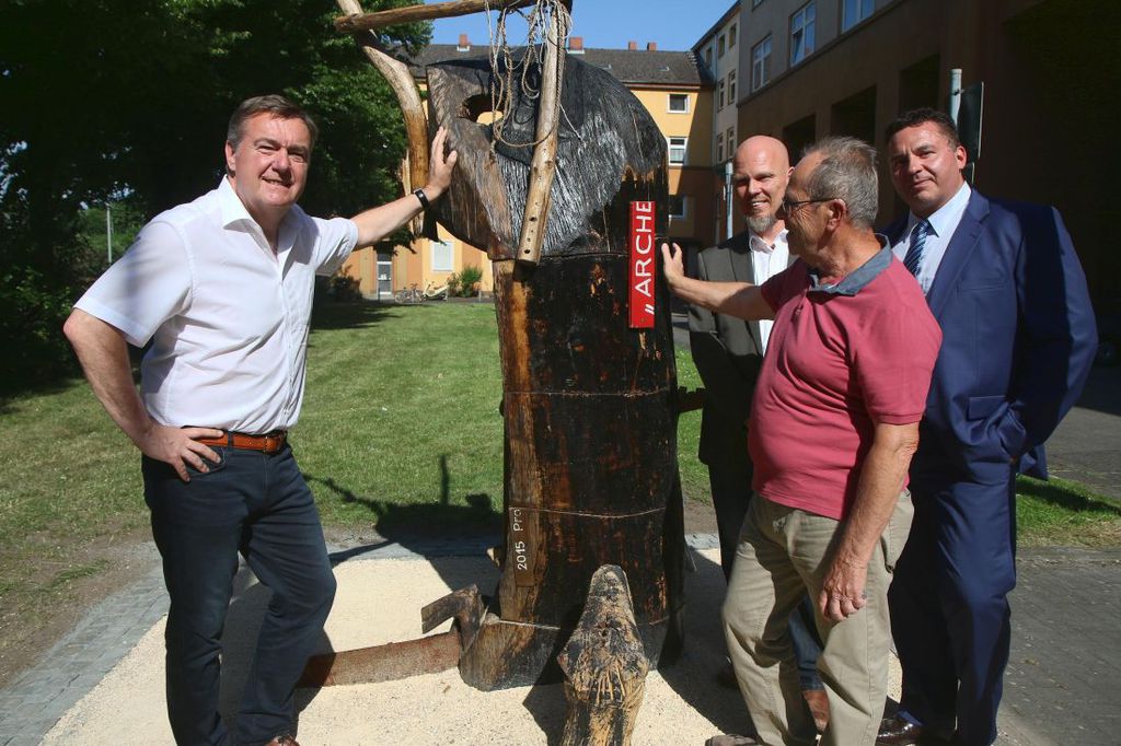 Gottwald ließ sich sofort für das Vorhaben gewinnen. „Es ist eine tolle Bestätigung für unser Konzept, dass dabei an uns gedacht wurde. Das zeigt auch eindrucksvoll, wie die Idee gelebt wird“, so Gottwald. Tatkräftige Unterstützung für das Projekt „Gestrandet“ gab es nach den Worten von Gottwald dann auch von Seiten des Eigenbetriebs Hanau Infrastruktur Service. „Ein großes Dankeschön an den Leiter von HIS, Markus Henrich, der uns die Fläche für die Ausstellung der Arche sofort zur Verfügung gestellt hat.“ Künftig kann das Kunstwerk auf der Wiese vor dem Hafentor in Augenschein genommen werden.
