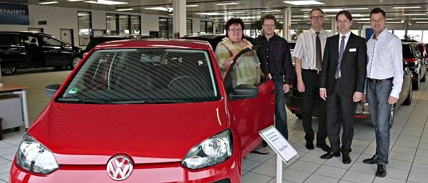 Denn völlig uneigennützig unterstützen Steffi und Uwe Winter mit Ihrer großen Druckerei Ingra seit Jahren die Turngemeinde. Gerade im Jubiläumsjahr der TGH war die Leistung der Ingra Druck GmbH von unschätzbarem Wert. Während des Balls konnte Steffi Winter zunächst von Herrn Mathias Ströbel, Verkaufsleiter des Hauses Volkswagen Automobile Frankfurt Hanau/Maintal den roten VW UP nur als Miniauto entgegen nehmen. Nachdem eine ordnungsgemäße Anmeldung durchgeführt wurde, war der große Augenblick da. Aus den Händen der Herren Ströbel und Seume wurde in den Hallen der Volkswagen Automobile Frankfurt Hanau/Maintal in der Filiale Hanau das Fahrzeug an Frau Winter übergeben.
