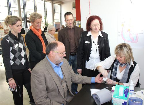 Viele Beschäftigte und Besucher nutzten das Angebot, den Cholesterinspiegel, die Zuckerwerte und den Blutdruck messen zu lassen. Ungünstige Cholesterinspiegel im Blut zählen zu den gefährlichsten Risikofaktoren für Herzerkrankungen, aber auch bei unerkanntem Bluthochdruck besteht die Gefahr, dass ein schleichender Prozess schwerwiegende Schädigungen der Gefäße und Organe herbeiführt. Die koronare Herzkrankheit ist die häufigste Herzerkrankung. Sie ist die Krankheit, die dem Herzinfarkt vorausgeht.