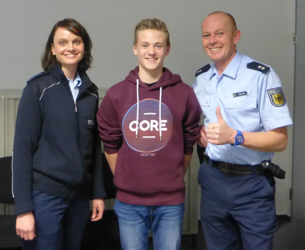 Foto (von links): Doreen Spath, Polizeihauptmeisterin, Sebastian R., Schüler, Michael Dippel, Polizeioberkommissar.