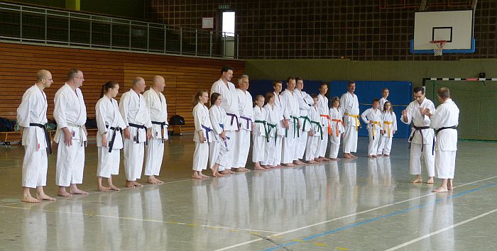 Nach dem Bezug der Wohnanlage am Freitagabend stand am Samstag das Karatetraining im Mittelpunkt. Dazu hatte der Verein eigens Bernd Milner aus Bochum, Träger des 8.Dans in Shotokan-Karate, engagiert. Schwerpunkt seiner Trainingseinheiten waren die ATEMI-Punkte des menschlichen Körpers. Deren Kenntnis lässt sich sehr effektiv für die Selbstverteidigung nutzen, da sehr heftige Schmerzen oder sogar Bewußtlosigkeit herbeigeführt werden können. Neugierig waren die Teilnehmer auch auf die Einführung in Shiatsu durch den Karatelehrer. Shiatsu ist eine aus der traditionellen chinesischen Massage entstandene Behandlungsmethode, bei der durch kräftigen Fingerdruck auf spezielle Körperpunkte Störungen von Körperfunktionen beeinflusst werden sollen. Beim Grillen und Unterhalten klang der Tag harmonisch aus.