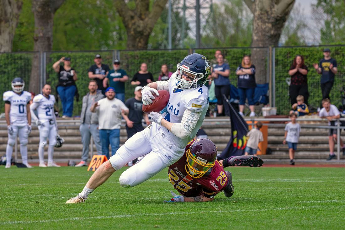 Knapp 1.000 Zuschauer hatten den Weg nach Rüsselsheim gefunden, um den Kampf um die Thomas-Meyer-Trophäe mit eigenen Augen mitzuerleben – das erste Highlight im noch jungen hessischen Footballjahr.