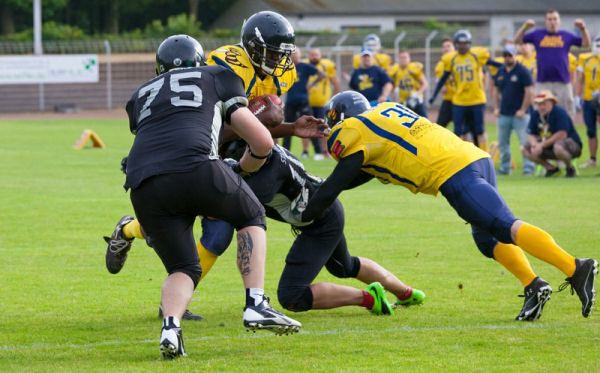 Im ersten Quarter entwickelte sich einer offener Schlagabtausch ohne dass die beiden Teams etwas zählbares auf die Anzeigetafel bringen konnten. Im zweiten Quarter dann die Gästeführung durch einen 3 yard Lauf in die Hanauer Endzone mit anschliessender Zwei-Punkt Conversion. Die Hornets schüttelns sich und antworten mit einem 25 yard Paß von Cliff Smith auf Rene Möll der fängt sicher – setzt noch einen 50 yard Lauf obendrauf und steht in der Endzone der Gäste. Hanau jubelt über den Anschlusstreffer der Hornissen – doch weit gefehlt Strafe gegen die Hornets wegen „Bein stellen“ der Touchdown zählt nicht, es bleibt bei der 8:0 Gästeführung. Der gut agierende Smith lässt sich nicht aus der Ruhe bringen. In höchster Bedrängnis bedient der 45-Jährige Sascha Baptist mit einem 22 yard Paß zum nächsten First Down doch am Ende können die Gäste den Hanauer Drive stoppen.
