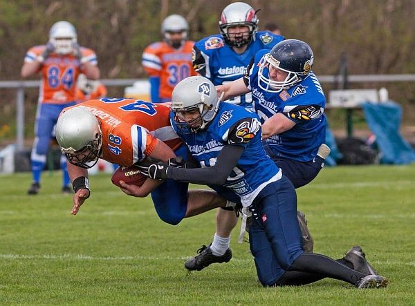 Nach der Kabinenpredigt von Headcoach Andy McMillan fanden die Hornets immer besser ins Spiel. Kurz vor der Pforzheimer Endzone dann wieder das alte Leid. Strafen werfen die Hornets soweit zurück dass am Ende “nur” ein Fieldgoalversuch blieb. Rene Möll war es vorbehalten die ersten Punkte der Hornissen zu erzielen. Den 25 yard Fieldgoalversuch verwandelte Möll sicher zum 3 : 15 Anschluss. Pforzheim will es wieder wissen. Versucht die Führung weiter auszubauen. Doch eine starke Hanauer Defense um Maximillian Lehmer, Marc Bucer und Mo Calik hält dagegen. Auch Hanaus Offense steht nun selbstbewusst auf dem Platz und kämpft sich vor die Pforzheimer Endzone. Diese Chance lässt sich Tyson Lee Bland nicht entgehen. Mit einem mächtigen Satz donnert der Münsterer in die Endzone und erzielt mit seinem Touchdown den 9 : 15 Anschluss für Hanau. Danach bringt Hanau jedoch immer wieder mit Strafen Pforzheim wieder besser ins Spiel. Routiniert nutzen die Gäste die Chance und erzielen mit einem 2 yard Lauf den 9 : 22 Endstand.