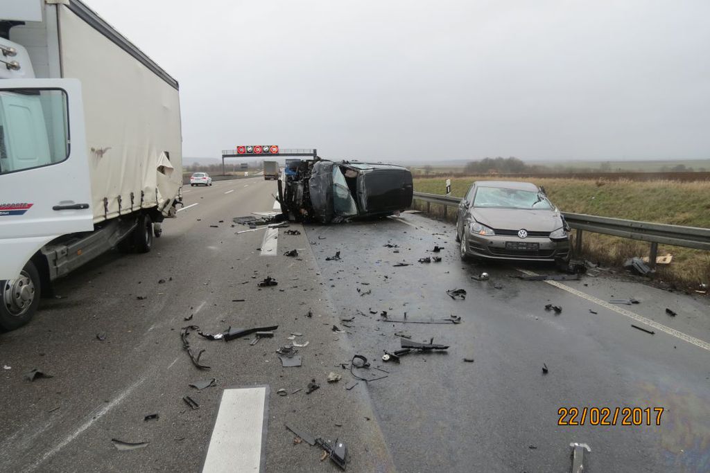 Der Golf wiederrum touchierte noch einen VW Beetle, welcher von einer 71-jährigen Spanierin gefahren wurde. Der Beetle fuhr daraufhin in einen auf dem Standstreifen stehenden Anhänger eines Streufahrzeugs. Der Range Rover überschlug sich mehrfach, bevor er schließlich zum Stehen kam. Am Range Rover, Golf, Klein-LKW der Marke Daimler und Beetle entstand ein Totalschaden. Daher wird bislang von einem Gesamtschaden von über 230.000 Euro ausgegangen. Fünf Personen kamen leichtverletzt in ein Krankenhaus. Die Fahrbahn der A 5 konnte gegen 13.50 Uhr wieder komplett freigegeben werden.