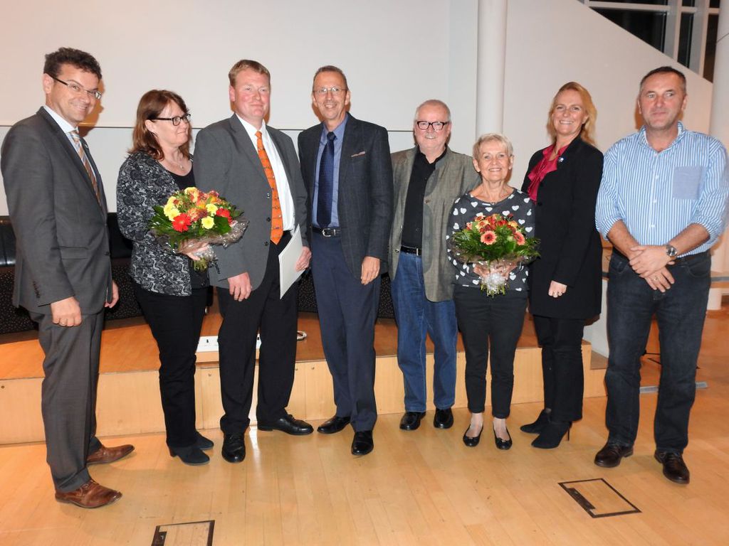 Foto (von links): Kreistagsvorsitzender Armin Häuser, Susanne Siefert (Lebensgefährtin Margrafs), der Belobigte Karl-Heinz Margraf, Landrat Joachim Arnold, Umweltschutzpreisträger Josef Tiefenbach und Ehefrau Marianne, Kreisbeigeordnete Stephanie Becker-Bösch, Festredner Martin Hormann.