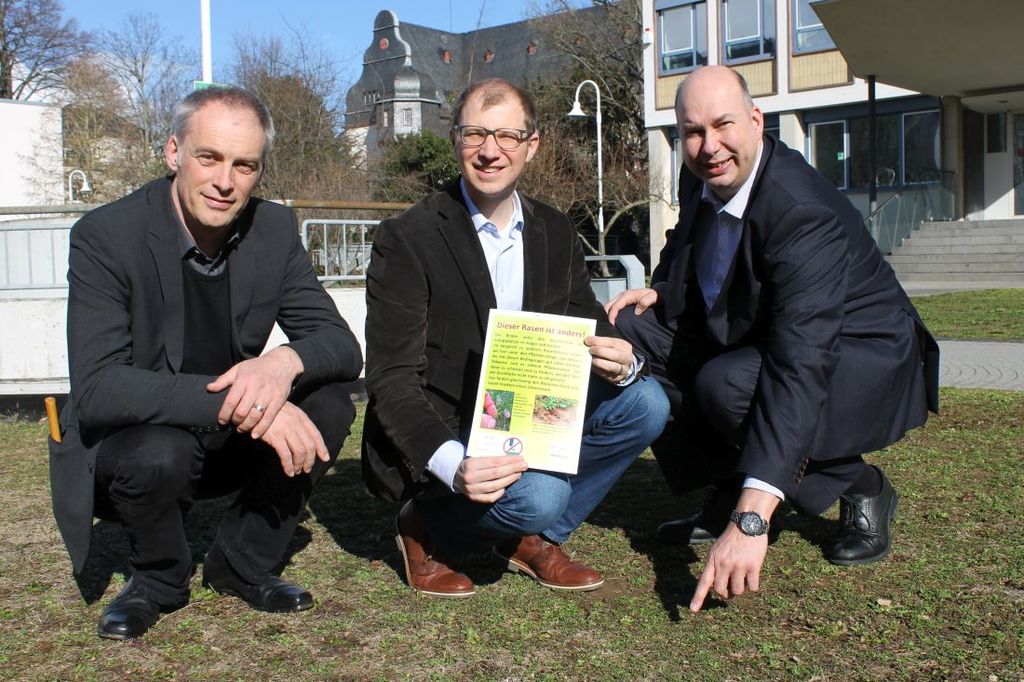 Foto: Landrat Jan Weckler, Kreisbeigeordneten und Umweltdezernenten Matthias Walther und den Leiter des Fachbereichs Regionalentwicklung und Umwelt, Christian Sperling auf dem Europaplatz, wo die seltene Platterbsen-Wicke nachgewiesen wurde.