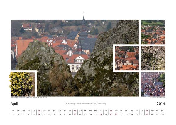 Im Format DIN A3 (42 x 29,7 cm) macht jede der zwölf Seiten Lust auf die Festungsstadt. Die Büdinger Grafikerin Judith Musch hat das Druckwerk aus den gesammelten Bildern der Tourist-Information sowie Büdinger Fotografen entworfen. Jedes Kalenderblatt widmet sich einem Thema, so werden etwa die Museen oder das Fachwerk gewürdigt. Eine Besonderheit bei der Gestaltung ist, dass auf einem Kalenderblatt gleich mehrere in Kontext stehende Fotos Platz finden. Christina Burkhardt, Geschäftsführerin der Büdinger Tourismus und Marketing GmbH, freut sich über die Möglichkeit, in diesem Erstlingswerk die vielen guten Bilder in einem größeren Format zu präsentieren. Sie erwähnt auch, dass die Büdinger Veranstaltungen einen festen Platz im Kalendarium haben und damit nicht vergessen gehen. Ab sofort kann der Kalender bei der Tourist-Information Büdingen, Marktplatz 9, Telefon: 06042-96370, Diese E-Mail-Adresse ist vor Spambots geschützt! Zur Anzeige muss JavaScript eingeschaltet sein! für 14,90 Euro erworben werden.