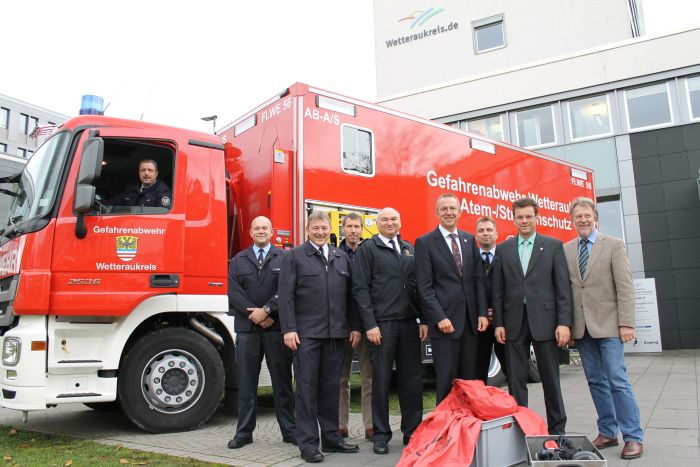 Kurz vor der Kreistagssitzung am vergangenen Mittwoch gab es noch einen Übergabetermin für die Feuerwehren in der Wetterau. Ein neuer Gerätewagen Atemschutz/Strahlenschutz wurde offiziell von Landrat Arnold an den Bad Nauheimer Bürgermeister Armin Häuser übergeben. Das Fahrzeug wird bei der Freiwilligen Feuerwehr in der Kurstadt seinen Heimathafen haben. Der Gerätewagen Atemschutz/Strahlenschutz kommt vor allem dann zum Einsatz, wenn der Bedarf an Atemschutzgeräten sehr groß ist oder spezielle Kleidung und Geräte benötigt werden. Oft ist das Fahrzeug Teil eines erweiterten Löschzuges und führt eine größere Anzahl an Ersatzflaschen für Pressluftatmer, Atemschutzmasken sowie Filter und Schutzanzüge mit sich. Auch Messgeräte wie Explosionswarngeräte, Dosisleistungsmessgeräte und Spürgeräte wie Geiger-Müller-Zähler gehören zur Ausrüstung des neuen Fahrzeuges.