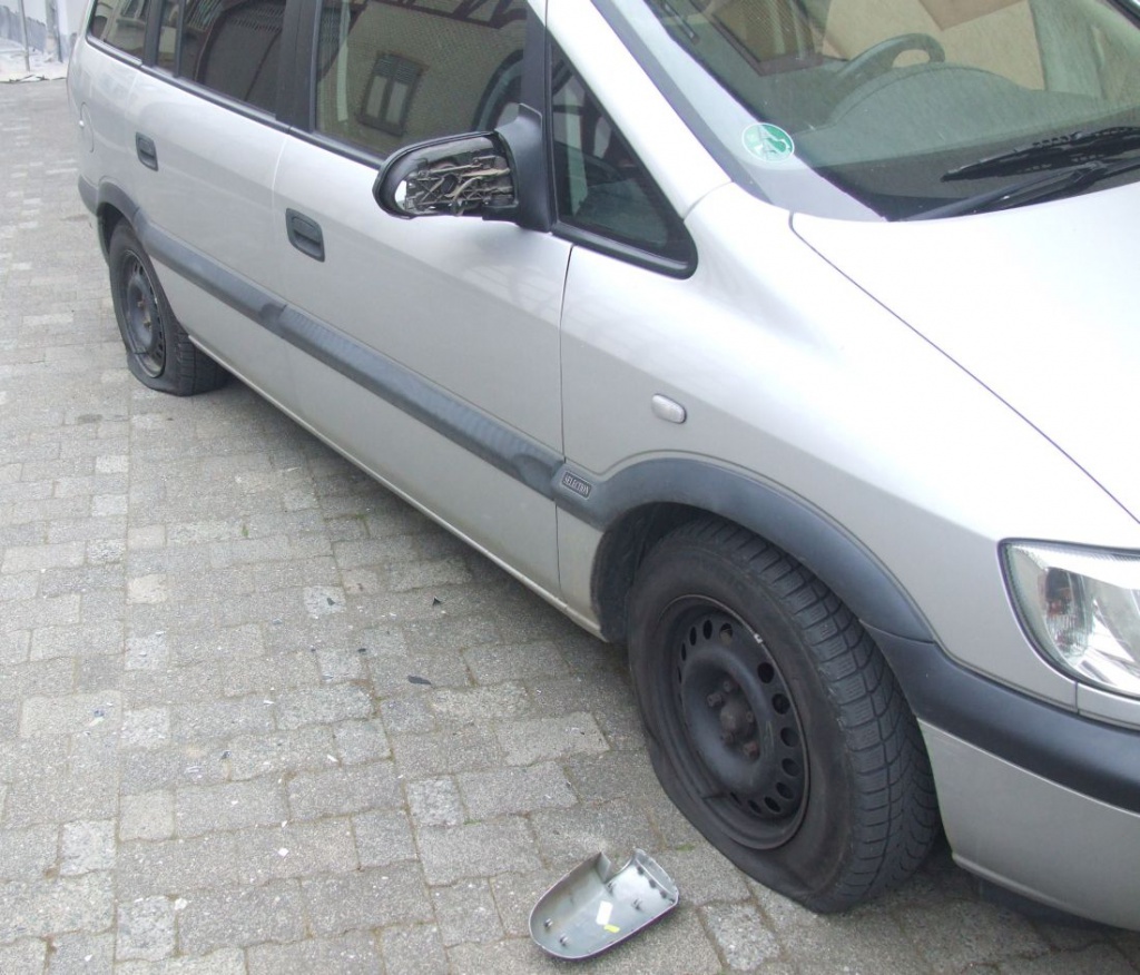 Foto: Beide Reifen platt gestochen und der Außenspiegel beschädigt - Wer ist für diese und viele weitere Sachbeschädigungen in Butzbacher Ortsteilen verantwortlich? Foto: Polizei Wetterau-Friedberg