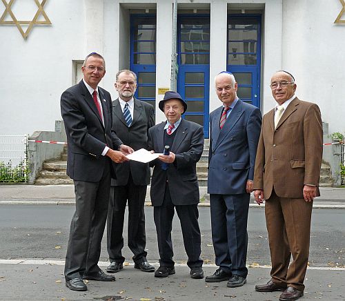 „Die Bad Nauheimer Synagoge steht baugeschichtlich für das „Neue Bauen“ der 20er-Jahre des vergangenen Jahrhunderts. Das Gebäude mit seiner schlichten Sachlichkeit soll nun äußerlich sein ursprüngliches Erscheinungsbild zurück erhalten“, erläuterte Landrat Joachim Arnold bei der Übergabe eines Zuschusses in Höhe von 3.000 Euro an die jüdische Gemeinde Bad Nauheim.