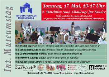 Im Rahmen des Internationalen Museumstages findet am Sonntag,17. Mai von 13 bis 17 Uhr für Groß und Klein (Großeltern, Eltern und Kinder) die 4. Matchbox Auto-Challenge im Museum im RadWerk statt.