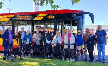 Seniorinnen und Senioren mit und ohne Rollator waren bei der Hanauer Straßenbahn GmbH zu Gast, um ein seniorengerechtes Verhalten im Bus zu üben.